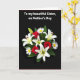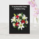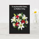 This card features a rich bouquet of flowers set against a deep black background, creating a dramatic, intimate contrast ❤️. Near the top, a white line of text reads, “To my beautiful Sister, on Mother’s Day,” centered and easy to notice. The arrangement includes large white lilies with gently curled petals and visible stamens, placed so they seem to lean toward the roses in a tender, affectionate way. Deep red roses sit among them with tightly layered petals, adding a romantic warmth to the scene. Small white daisies with sunny yellow centers are tucked throughout, bringing a lighter, friendly touch 🌼. Green leaves and stems fill the gaps, framing the blooms and giving the bouquet a full, fresh shape. Soft lighting highlights the edges of each petal and leaf, making the flowers glow against the dark space. The white lettering sits above the bouquet while the crimson roses cluster slightly right of center beneath the lilies.