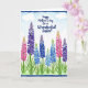 This card features a soft watercolor scene of tall flower spires rising from a lush green base, like a garden grown with extra care for someone close ❤️. The blooms shift through fuchsia, coral, purple, and deep blue tones, with lighter periwinkle and small peach touches that make the field feel gently romantic. Loose brushstrokes and blended color washes give the petals and leaves a tender, affectionate look, as if the flowers are leaning toward one another in quiet friendship. Above the flowers, a pale blue sky stretches across the top with a few fluffy white clouds drifting by 🌼. Near the upper center, the message “happy Mother’s day to a Wonderful Sister” sits in a flowing dark blue style, clearly set against the sky. Deep blue bands frame the scene along the top and bottom edges, keeping the colorful garden neatly contained. The lower half is densely filled with layered stems and blossoms, while the upper half stays airy with sky and clouds in light, watery blue.