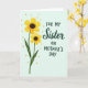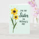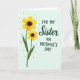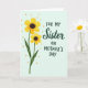 This card features two stylized yellow flowers on the left, their sunlit petals opening around deep brown centers as if leaning toward each other like close friends ❤️. Slender green stems rise from the lower edge, with long, slightly jagged leaves fanning outward to add a natural, easygoing look. The background is a soft greenish-blue wash that keeps the scene calm and airy, like a quiet morning outdoors. On the right side, the text is stacked in three parts, with “FOR MY” at the top and “ON MOTHER’S DAY” at the bottom in a simple, easy-to-read style. The word “Sister” sits larger in the middle in a flowing cursive-like lettering, drawing the eye and giving the message a more intimate feel 🌼. The lettering appears in a dark tone that contrasts clearly against the pale background. Small orange dots are sprinkled across the open space, forming a light polka-dot pattern around the flowers and the words. The two blossoms face slightly inward, with dark centers and bright petals set against the misty green-blue field and scattered orange specks.