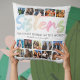 Custom sister throw pillow featuring a simple white background that can be changed to any color, the word "sisters" in a pastel rainbow gradient script font, a sibling quote, your names, and a 15 square photo collage template for you to personalize with your own images.