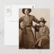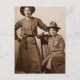 Vintage photo of two women from the old west. One is sitting and one is standing, They both have skirts with fringe and are wearing hats. One has a gun in a holster at her waist