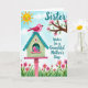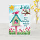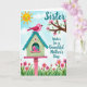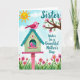 This card shows a soft, painted-style garden scene centered on a pale green birdhouse with a teal roof, standing on a bright pink pedestal. A round, rosy bird with darker pink wing accents rests on the roof, while a smaller companion with blue‑green wing details peeks from the arched opening, their close spacing suggesting a cozy, affectionate bond ❤️. In the upper left, a smiling yellow sun glows against a light blue sky with a few small white clouds. To the right, a slender branch reaches in with clusters of light pink blossoms, like it’s leaning closer to the birdhouse. Along the bottom, tall green grass rises around pink flowers, some dotted with yellow or blue centers, adding a gentle springtime feel 🌼. The word “Sister” sits near the top in dark lettering, and “Wishes for a Beautiful Mother’s Day” is placed to the upper right in a matching dark tone. The birdhouse opening is outlined in a slightly darker green, and the teal roof is shaded to show a simple ridge and eaves.