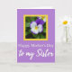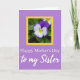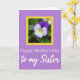 The front design shows a calm lavender-purple background that fills the card with a soft glow. Near the top, a garden-style flower sits like a small gift, with deep purple upper petals fading into white and meeting a sunny yellow center marked by fine dark lines, tucked among green leaves. That floral scene is set inside a bright yellow rectangular border, giving it a cheerful, affectionate feel ❤️. Below the frame, the words “Happy Mother’s Day” appear centered in a classic serif style in a dark tone that stands out clearly on the purple. Under that, “to my Sister” is placed as a second line in a flowing cursive look, adding a tender, close-knit touch 🌼. The mix of the strong yellow border and the gentle purple background creates an easy, romantic warmth, like a caring note shared between family members. The yellow rectangle sits above the two-line message, with the flower centered inside it against the purple field.