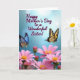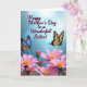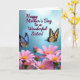 This greeting card features a soft sky-blue background with gentle light spots that make the scene feel airy and affectionate ❤️. Near the upper middle, the text reads “Happy Mother’s Day to a Wonderful Sister!” in deep purple lettering, centered so it draws the eye first. Two butterflies frame the message like quiet companions, angled inward as if sharing a tender moment. The butterfly on the left has shimmering blue wings touched with pale gold, while the one on the right shows sunny yellow panels edged with dark charcoal markings. Below them, the lower portion fills with pink, daisy-like flowers, their petals layered at different depths to create a cozy, close-up garden feel 🌼. Bright yellow centers stand out against the pink petals, and thin green stems peek through to add a natural base. The flowers cluster thickest along the bottom edge, with a few blossoms rising slightly higher toward the middle. A soft blur behind the butterflies and the crisp detail in the foreground blooms creates a gentle contrast across the whole design.