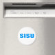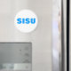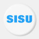 Cute button showcasing the Finnish characteristic of Sisu, or guts, in bold, blue letters.
