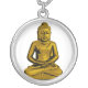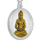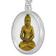 Picture of sitting Buddha. Buddha is focused, meditating with his eyes closed and legs crossed. Gold color.