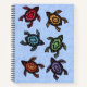 This spiral notebook is light blue with a group of six abstract turtles with brightly colored patterned shells in blue, red, yellow, green, purple, and orange.