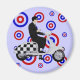 Sixties check mod scooter rider with red and blue circle artwork. Hand drawn and colored artwork great gift for any lover of sixties mod culture or scooters