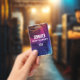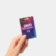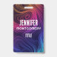 A name tag with a cool pattern with a sixties vibes. Rainbow colored circles and swirls.