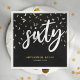Modern 60th birthday party napkins featuring a stylish black background, gold confetti, the title 'sixty' in a bold white script font, the saying 'happy birthday', their name, and the date of the celebration.
