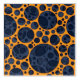 A vibrant pattern showcases a series of interconnected dark blue circles set against a bright orange background, creating a striking contrast. The overlapping arrangement gives a sense of depth and movement. Illustration design of trippy abstract orange and blue lava slime holes. Tags: abstract, dots, geometric, crazy, orange, blue, hallucinogenic, holes, psychedelic, lava, trippy, trypophobia