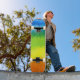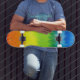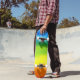This quality made skateboard is shown with a abstract art pattern print in colors of the rainbow.