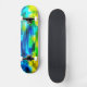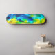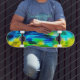 This quality made skateboard is shown with a abstract art pattern print in colors of blue, green and yellow.