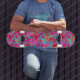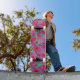 Skateboard shown in a hot pink multi colors tropical palms graphic print.