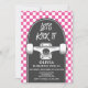 Skateboard Let's Kick It, Birthday invite with pink check and skateboards.