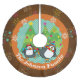 Beautiful Christmas holiday tree skirt features two adorable penguins in ice skates, striped scarves, and winter hats and three decorated Christmas trees on a background of brown, with colorful snowflakes, a ring of solid orange with white snowflakes, and a center of aqua blue with little white polka dots. You can easily customize this festive holiday tree skirt with your family name!
