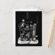 skeleton band vintage postcard: here we have black and white vintage death art from 1850, a skeleton sits with skeleton instruments including a guitar a horn and a harp other skulls and bones as well as an hourglass set the scene. Drapes are parted above.