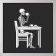 High-contrast skeleton sipping coffee at a table; monochrome, bold silhouette with a playful macabre vibe for edgy streetwear and novelty apparel.
