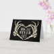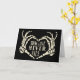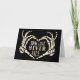 This goth wedding card is perfect for couples who prefer things to be a little spooky and creepy. This card features an illustration of skeleton hands in a heart shape framing the message TRUE LOVE NEVER DIES. The graphic and lettering are in a cream or ivory color against a black background. The inside message in black lettering is ready for you to add your own custom greeting.