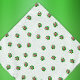 This bandana or handkerchief is white with bright green polka dots and repeated image of silly skeleton wearing a Santa Hat holding ornaments up to his eyes in the center of a vibrant red and green spatter design.