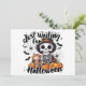 This playful Halloween design features a stylish skeleton in a witch hat, surrounded by pumpkins, bats, and cobwebs, clutching a pumpkin spice latte like it's the potion of the season. The cheeky phrase “Just Waiting for Halloween” floats above, capturing the mix of anticipation and cozy fall vibes. With its vibrant colors and humorous twist, it’s perfect for apparel, seasonal signage, or autumn-themed gifts that celebrate caffeine-fueled Halloween obsession.