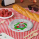 This paper plate has a smiling skeleton holding red and green ornaments with snowflakes up to his eyes wearing a red Santa hat inside a wavy dimensional shape on a white background with circles of various sizes. Customise the Merry Christmas text with the templates.