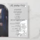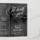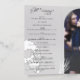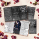 Trifold wedding program for a goth wedding in shades of black, gray and white with skulls, skeletons, and skeleton hands, and an elegant script with your photo inside the goth wedding program in an arch shape with pale bony skeleton hands. Write ceremony program, wedding party, and your love story. Upload your favorite dark romance photo for a personal touch. Til death do us part on the cover and a fun by the numbers section. Add your QR code too for easy sharing of photos for your guests.