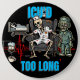 Rendered in pop medical tones like emergency red (#E63946), scrub green (#4CAF50), and code-blue highlight (#00BFFF), the artwork bursts against the button’s glossy surface. The bold block sans-serif lettering of “ICU’d Too Long” in bright cyan with a dark drop shadow gives it an exhausted yet eye-catching vibe.