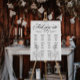 Elegant Halloween wedding seating chart sign in white with light grey skeletons, a swirly calligraphy script, and your seating chart.
