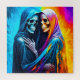 Two Skeletons cuddling under a blanket with a rainbow background.