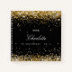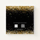 A stylish black background with faux gold glitter dust. Add a year, your name, and a title. The name is written with a modern hand lettered style script.