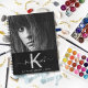 A chic black background. Personalize and add your own photo, a name, monogram letter and a year. The name is written in white with a large modern hand lettered style script with swashes. The monogram letter in gray. For school, work as a sketchbook, diary and journaling. To keep the swashes only delete the sample name, leave the spaces or emoji's in front and after the name