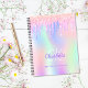 A trendy holographic colored background with unicorn and rainbow pastel colors in pink, purple, rose gold, mint green. Decorated with faux glitter drips in rose gold, pink and purple. Personalize and add your monogram initials, firs name and full name. Purple and white colored letters. A notebook for drawings, sketching, notes and school homework.
