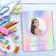 A trendy holographic colored background with unicorn and rainbow pastel colors in pink, purple, mint green. Personalize and add a photo and name, The title: sketchbook written with a girly modern hand lettered style script with swashes. Purple colored letters. A notebook for drawings, sketching, notes and school homework.
