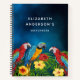 A notebook with blank pages for your craft ideas, sketching, doodling and drawings for teen girls and women. A dark blue sky as background. Three parrots in blue, red and yellow sitting on green palm tree leaves. Yellow florals, flowers Hibiscus. Add your name and the book title. White text.