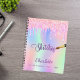 A trendy holographic colored background with unicorn and rainbow pastel colors in pink, purple, mint green. Decorated with drips in pink and purple. Personalize and add a name, The title: sketchbook written with a girly modern hand lettered style script with swashes and a brush. Purple colored letters. A notebook for drawings, sketching, notes and school homework.