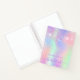 A trendy holographic colored background with unicorn and rainbow pastel colors in pink, purple, rose gold, mint green. Decorated with pink faux glitter dust. Personalize and add a name, The title: sketchbook written with a girly modern hand lettered style script with swashes. Purple colored letters. A notebook for drawings, sketching, notes and school homework.