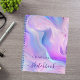 A trendy holographic colored background in pink, purple, blue. Personalize and add a name, The title: sketchbook written with a girly modern hand lettered style script with swashes. Purple colored letters. A notebook for drawings, sketching, notes and school homework.