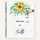 A white background. Decorated with sunflowers, eucalyptus greenery, a paint brush. Personalize and add a title and name. Black colored letters. The name is written with a modern hand lettered signature style script. A notebook for drawings, sketching, notes and school homework.