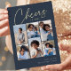 Share cheer with these modern New Year holiday cards featuring 6 of your favorite photos in a grid collage layout. "Cheers to [Year]" appears at the top in gold foil serif and casual hand sketched cursive script. Personalize with your family name at the lower right.