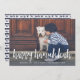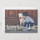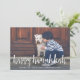 Share holiday greetings with these Hanukkah photo cards featuring your favorite horizontal or landscape oriented photo in striking full bleed. "Happy Hanukkah" appears at the bottom as a text overlay in white brush lettered typography. Personalize with your family name or names beneath, and a custom greeting if desired. Cards reverse to a watercolor dot and leaves pattern in navy blue and white.