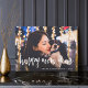 Share holiday greetings with these new year photo cards featuring your favorite horizontal or landscape oriented photo in striking full bleed. "Happy New Year" appears at the bottom as a text overlay in white brush lettered typography. Personalize with your family name or names beneath, and a custom greeting if desired. Cards reverse to a watercolor dot and leaves pattern in black and gray on white.