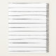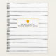 A teacher planner featuring a sketchbook inspired black and white thin stripes design on front and back. Front features custom text under illustration of a golden yellow apple.