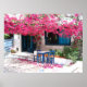 From an original photograph by Yvonne Ayoub showing the typically Greek blue taverna chairs under a hot pink canopy of Bougainvillea.