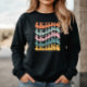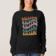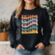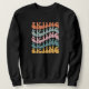 Skiing sweatshirt. © Tees & Sweats at Zazzle. This sweater has the word Skiing repeated in retro font and various colours.