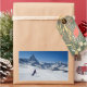 Rectangular photo sticker with a female skier skiing on the slopes of Matterhorn mountain through fresh snow on a beautiful day with a clear blue sky in ski resort Zermatt, canton Valais in Switzerland.