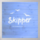 Fun sailing poster with the word Skipper written in a cool white font. Gorgeous bright blue wood effect background and white seagulls flying above. Great for maritime and nautical themed rooms, boat clubs and beach bars. Look out for co-ordinating products within my store.