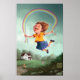 A young girl jumps rope made from a rainbow in this whimsical storybook style illustration by artist Karyn Lewis. Behind her, butterflies flit on the grass and it looks like a summer storm has just passed. But is the rainbow real? Or does she skip rope only in her imagination?