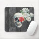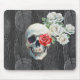This striking mouse pad features a detailed white skull with a red rose in its eye socket