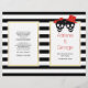 Skull couple with a red bow the bride and red hat the groom, and black and white stripes modern red Halloween folded wedding ceremony and party program. There are white frames with gold outline with your text.